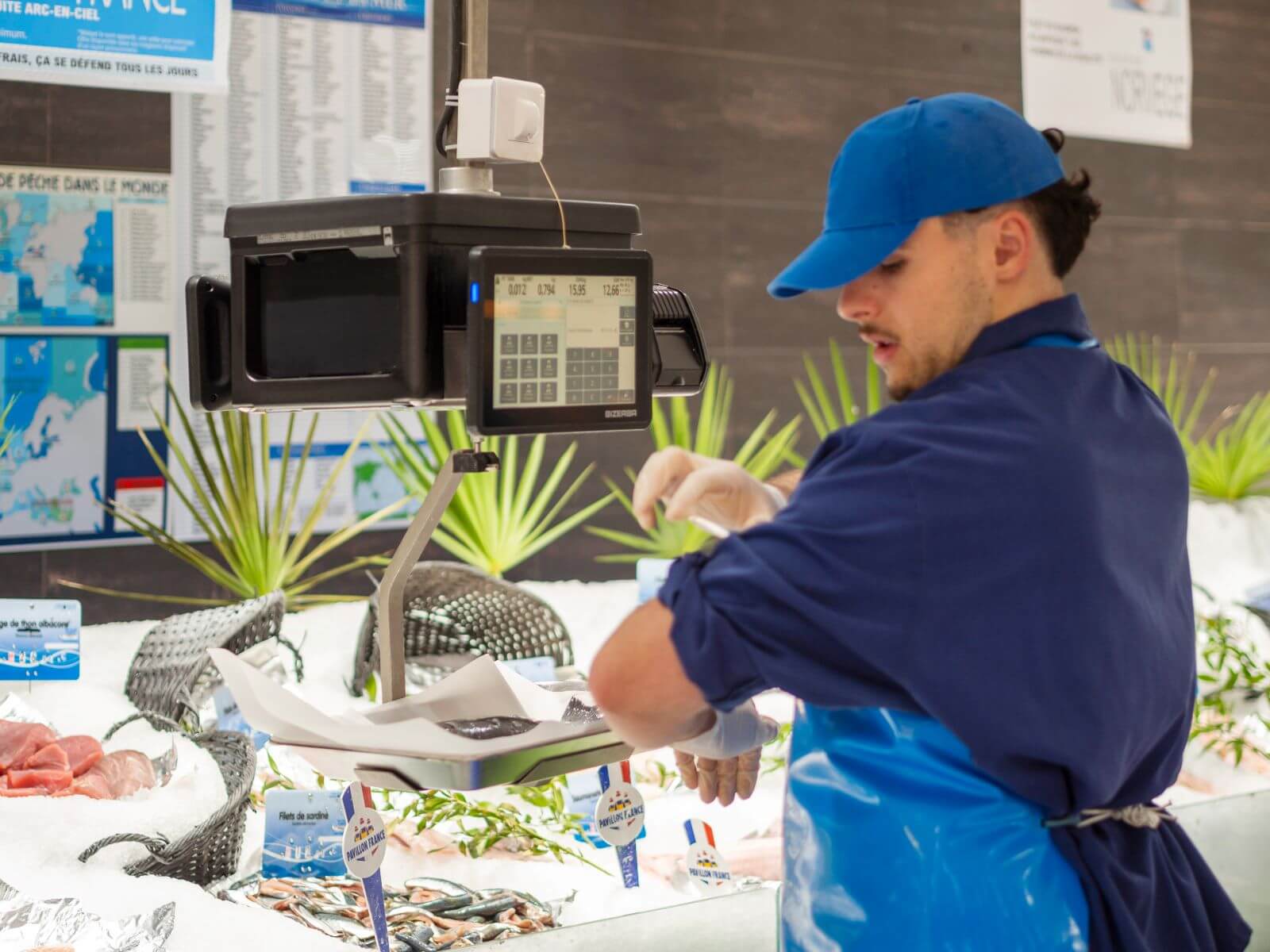 Básculas conectadas en la pescadería de E.Leclerc, Trélissac, Francia
